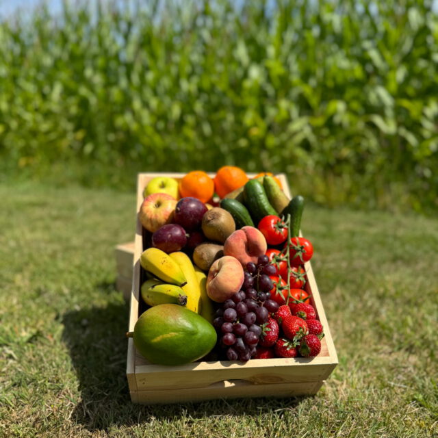 Het fruitkistje bevat een gevarieerd assortiment: klassiekers zoals appels, peren, bananen en druiven zijn altijd aanwezig, aangevuld met seizoensgebonden fruitsoorten voor extra afwisseling.